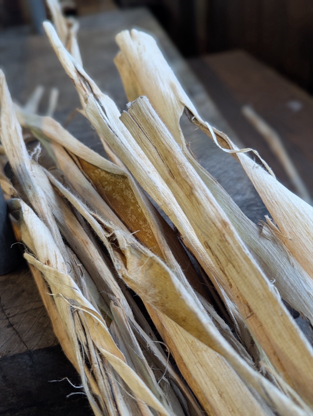 Matsuzaki-san met us in the main workshop. He explained the process the way someone explains breathing: simply, because it is simple, and because he has done it every day for decades. Washi begins as kozo, the inner bark of the mulberry tree. The fibres are stripped, soaked, boiled with wood ash, rinsed in river water, then beaten by hand until they separate into a cloudy pulp suspended in a vat of water. The vat in front of us was waist-high, wide as a dining table.